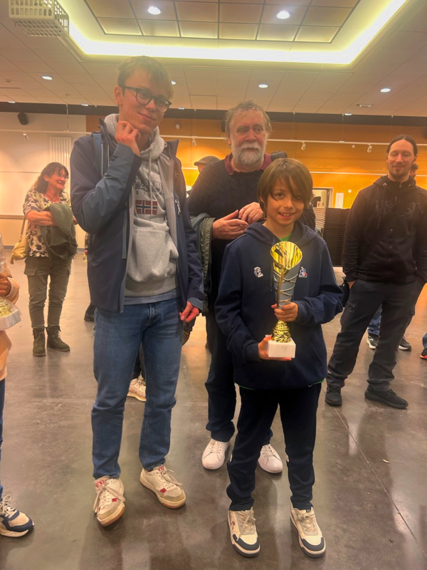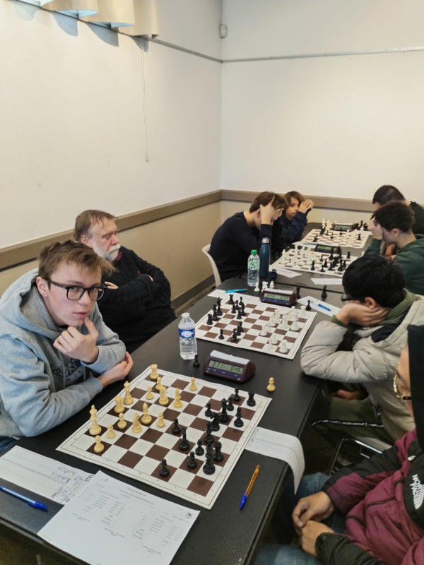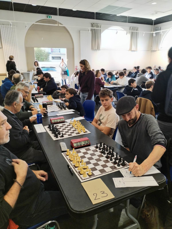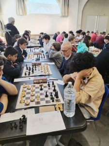 Enfin, Fred, capitaine de l’équipe 3 avec 5 joueurs pour 4 places et surtout de très jeunes joueurs(Adam, Gaston, Pierre et Émilien), nous livre ses impressions : « le gentil retour d’un papa satisfait vaut pour moi beaucoup plus que mes 2 points gagnés dans la souffrance sur les rondes 2 et 3 au 1er échiquier. 🙂 Le héro de le ronde 1 est Adam qui arrache une nulle de combat contre un plus de 1700. Pour la ronde 2, je mise donc sur Adam et laisse Gaston au repos. Malheureusement le coup de poker n’est pas gagnant, on joue des joueurs plus expérimentés ( ronde 2 mais aussi par malchance à l’appariement à la ronde 3) et malgré l’application de tous les jeunes, ça finit toujours par craquer! Néanmoins l’objectif est atteint, tout le monde à vécu une belle expérience et passé une bonne journée. »
