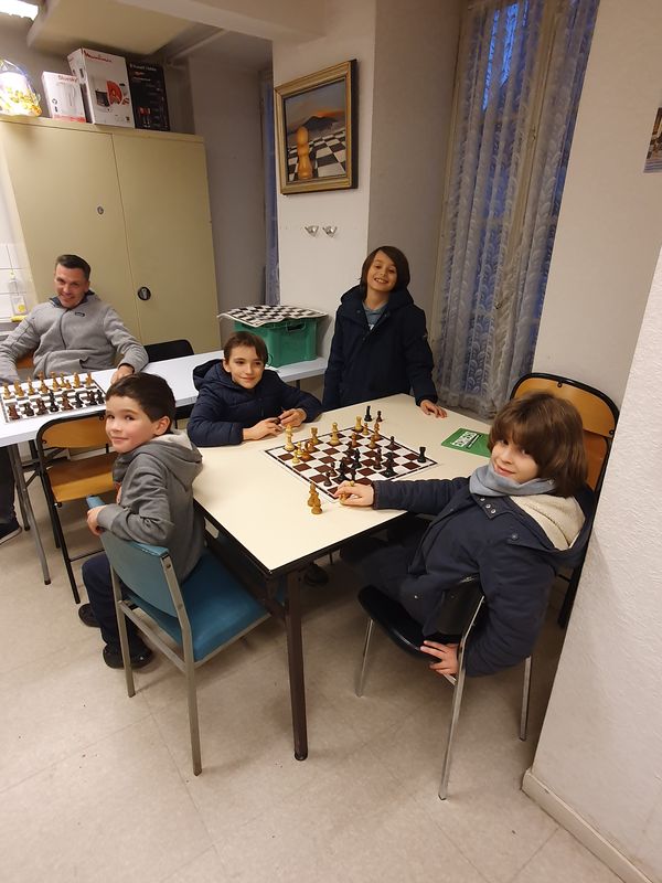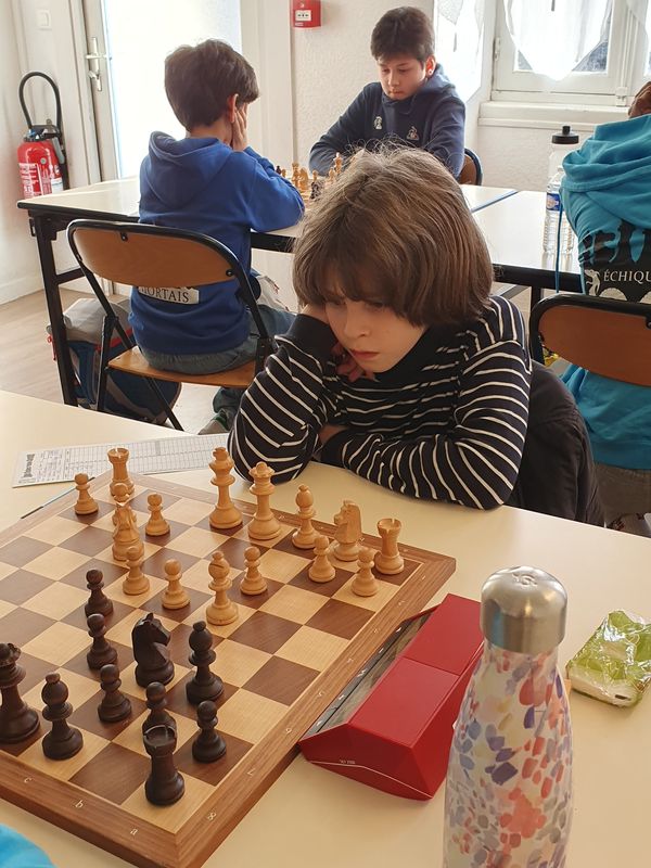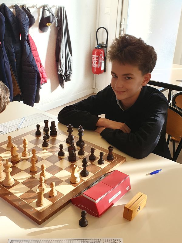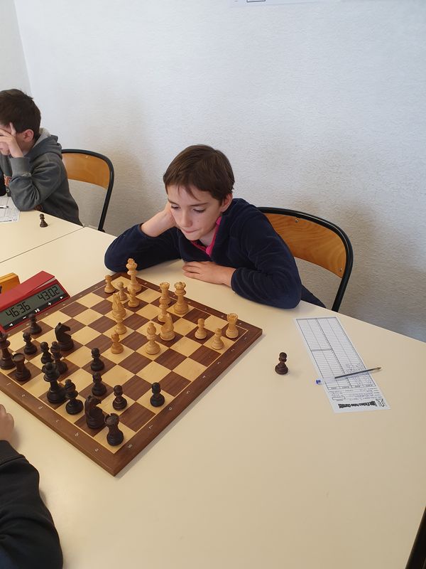 Pendant ce temps, les autres échiquiers sont très équilibrés et ce n’est que vers l’heure de jeu et surtout à l’heure et demie que les choses vont se décanter. Tim enferme la dame adverse, Camille pique une qualité, Sacha profite des largesses adverses… Ça commence à sentir bon. Les poussins reprennent et cette fois c’est Pierre le plus rapide. 3-0. Tim s’impose malgré une bonne résistance 5-0 et Émilien joue vraiment bien et chaque gaffe adverse est sanctionnée. 6-0. Quelques temps après, Sacha gagne aussi. A 8-0, il faudrait un tsunami pour ne pas gagner. Camille ne nous fera pas languir et ajoute la partie de la victoire. 10-0, le match est plié mais il reste des parties intéressantes. Martin avec un bon gros avantage, oublie son couloir et doit se contenter d’une finale de tours avec un pion de plus probablement égale. On n’en a pas encore parlé mais les minimes (U16), devant, ont fort à faire. Pas sûr que Nouaym ait été bien tout le temps. Il joue une partie où les fous de couleurs opposés sont maintenant propices à l’attaque… Ou à la nulle si les autres pièces s’échangent. Mais Nounou trouve un trou de souris pour glisser une tactique et gagner le fou adverse. Ouf.