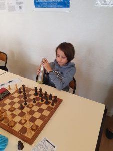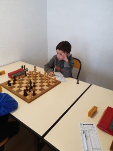 D’abord, les « pious-pious » ont montré la voie! En U10, Émilien est expéditif lors de sa première partie et amène vite le premier point. Ce sera plus accroché pour Pierre qui donne d’abord un pion mais cette erreur lui donne un peu de jeu et il profite de la première combinette qui passe pour piquer une pièce. Il ne la lâchera plus et mène de main de maître, tranquillement son armée à la victoire. 2-0. Une courte pause pour les poussins avant une 2ème partie…