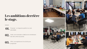 Au menu, accueil entre 9h15 et 9h45 puis 2 séances de travail le matin et une troisième l’après midi suivie d’un tournoi, soit environ 3 heures d’enseignement et 2 heures de jeu.